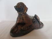 Stor hund av bronserad zink (?). På ryggen är bronseringen delvis bortsliten. Fylld med gips och mycket tung.