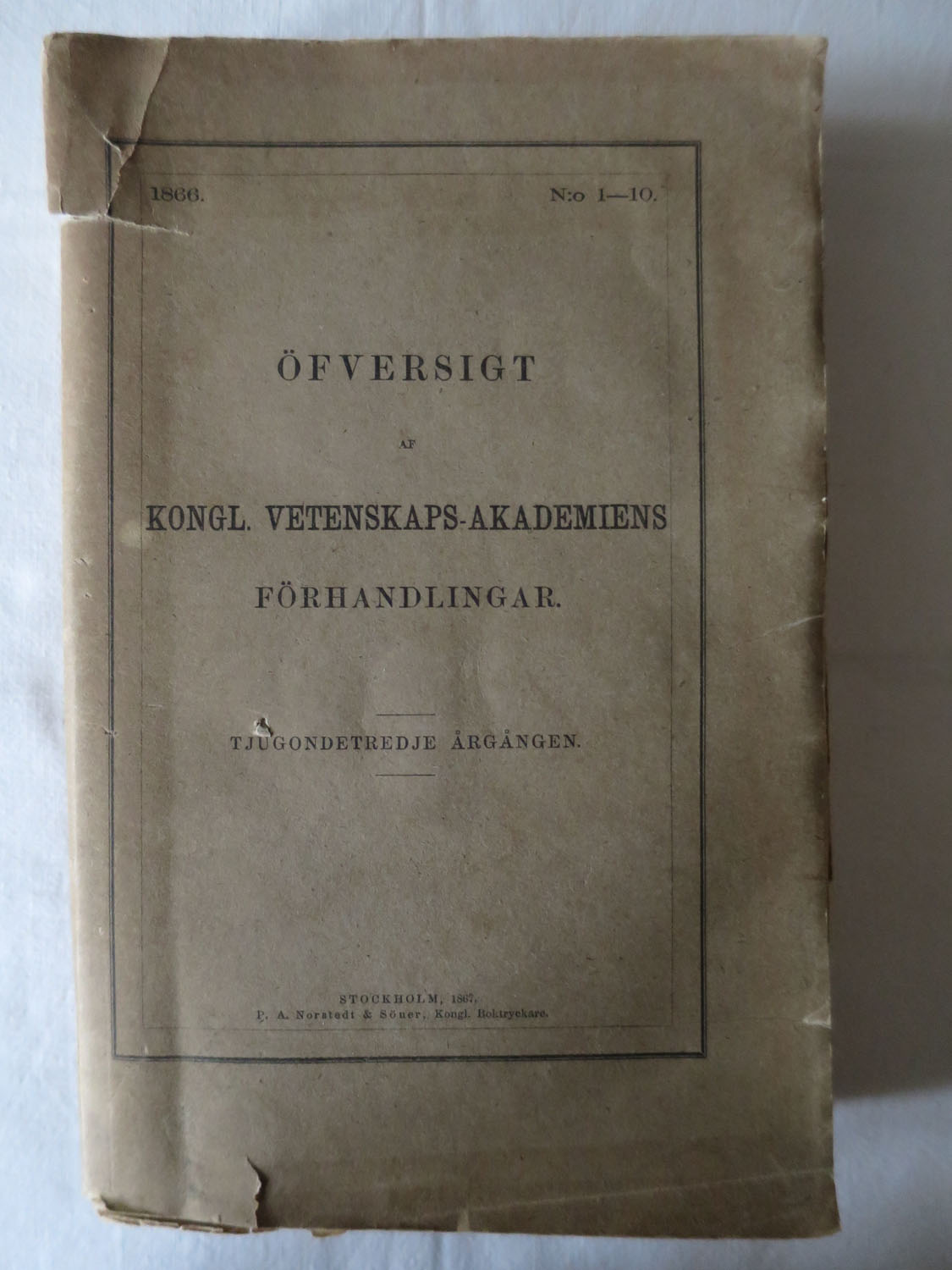 Öfversigt af Kongl. Vetenskaps-Akademiens Förhandlingar. Tjugondetredje Årgången 1866 med tretton taflor. 562 sid. Stockholm 1867. Hft. och ouppskuren. Omslgen med...