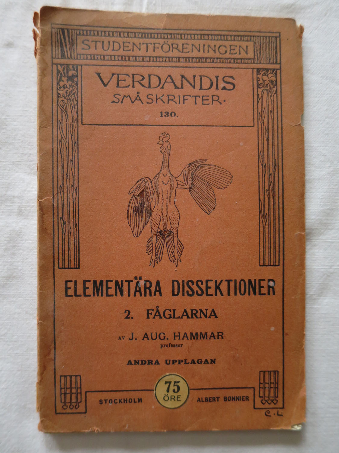HAMMAR, J. AUG.: Elementära dissektioner 2. Fåglarna. Studentföreningen Verdandis småskrifter 130. 56 sid. Hft. Illustrerad med teckningar i svv. Trasigt omslag och...