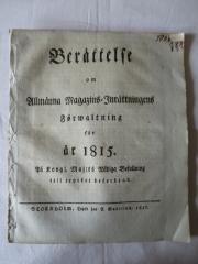 Berättelse om Allmänna Magasins-Inrättningens Förvaltning för år 1815. 1817. 44 sid. Hft. och tagen ur band. Bra skick.