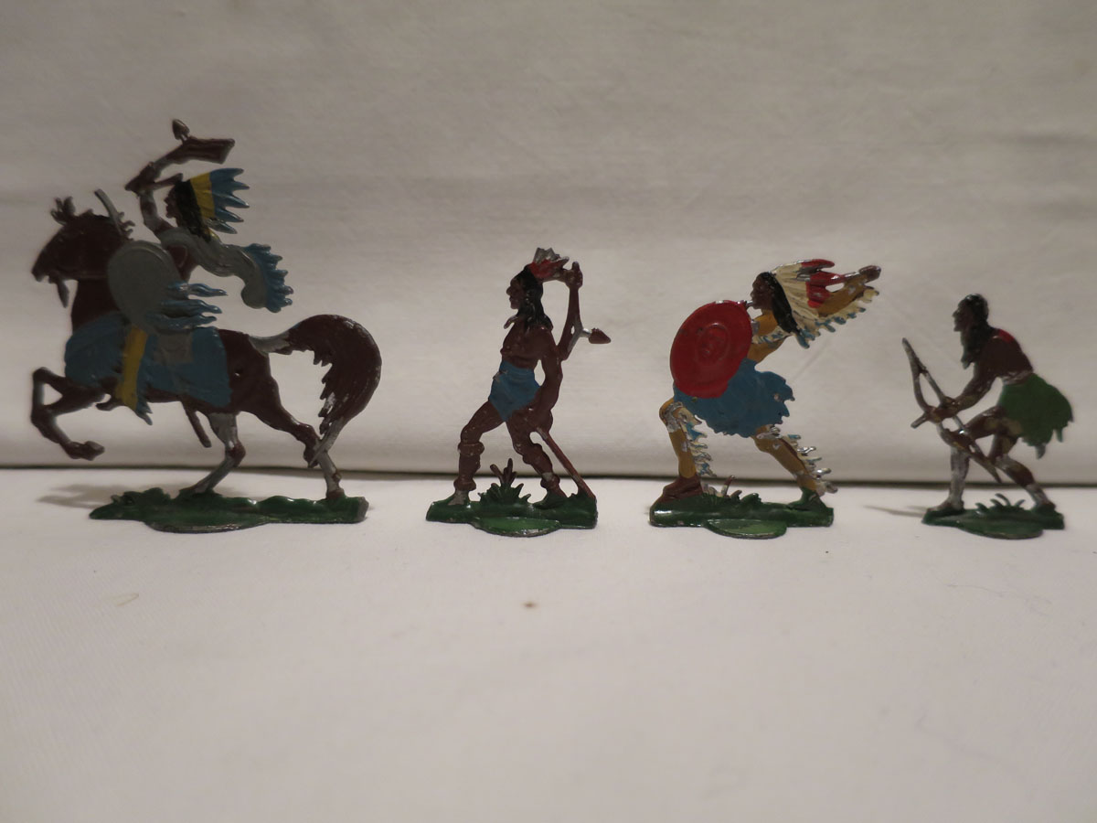 Mycket välgjutna och målade indianer av tenn. Några små delar saknas på vissa av figurerna. Enligt uppgift är dessa indianer gjutna på tenngjuteriet Mars i Stockholm...