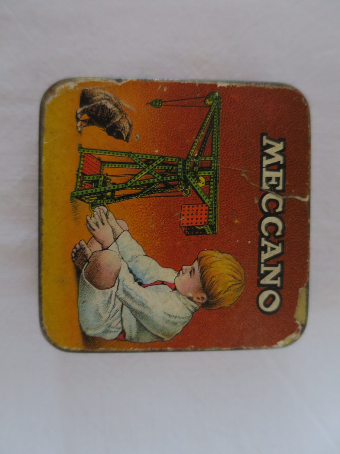Meccano-ask av bleckplåt med påklistrad etikett, som är något sliten i hörnen. 1920-tal???
