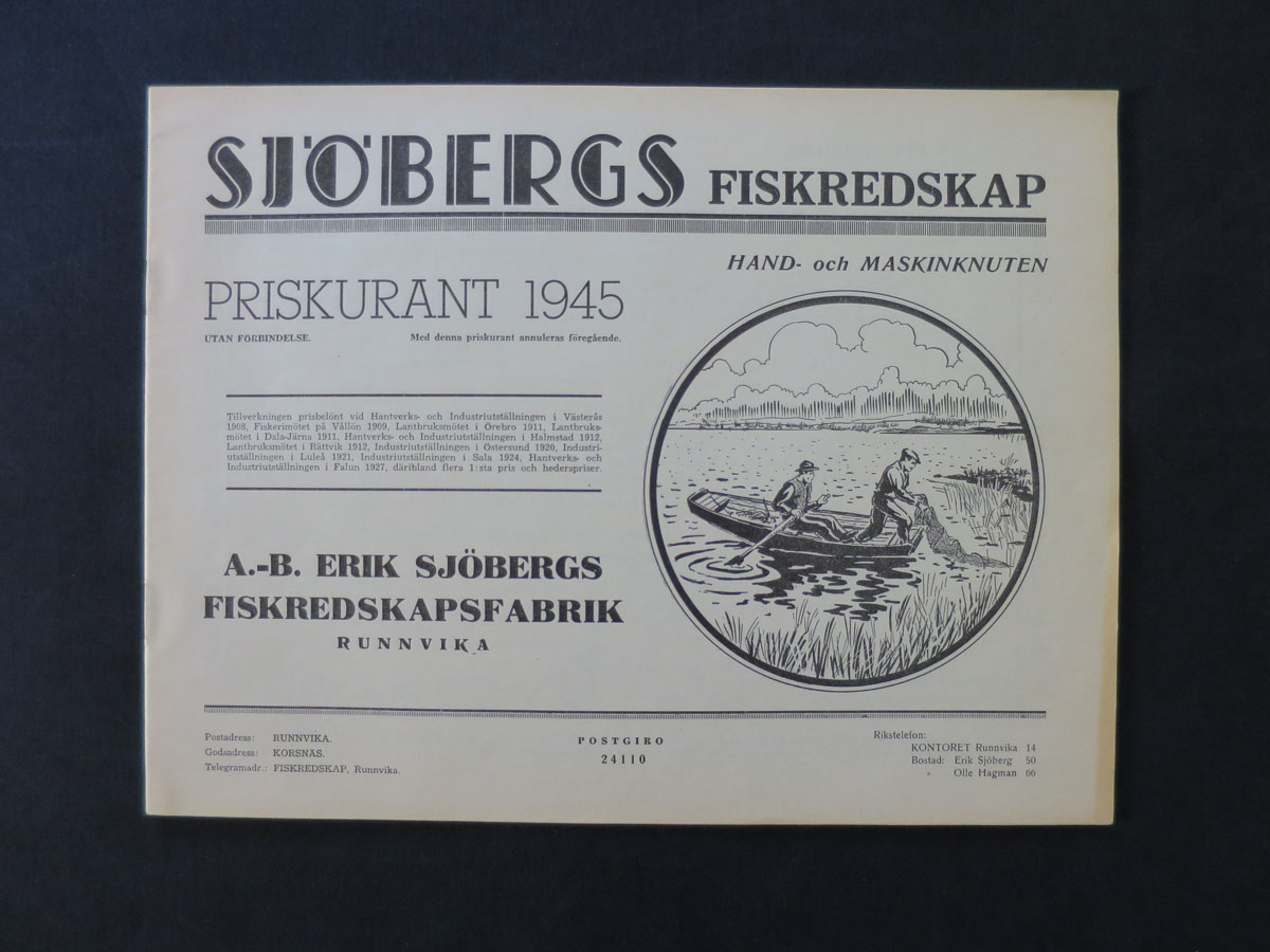 Utgiven av A.-B. Erik Sjöbergs Fiskeredskapsfabrik i Runnvika. En priskurant om 30 sidor i ett nästan helt perfekt skick...