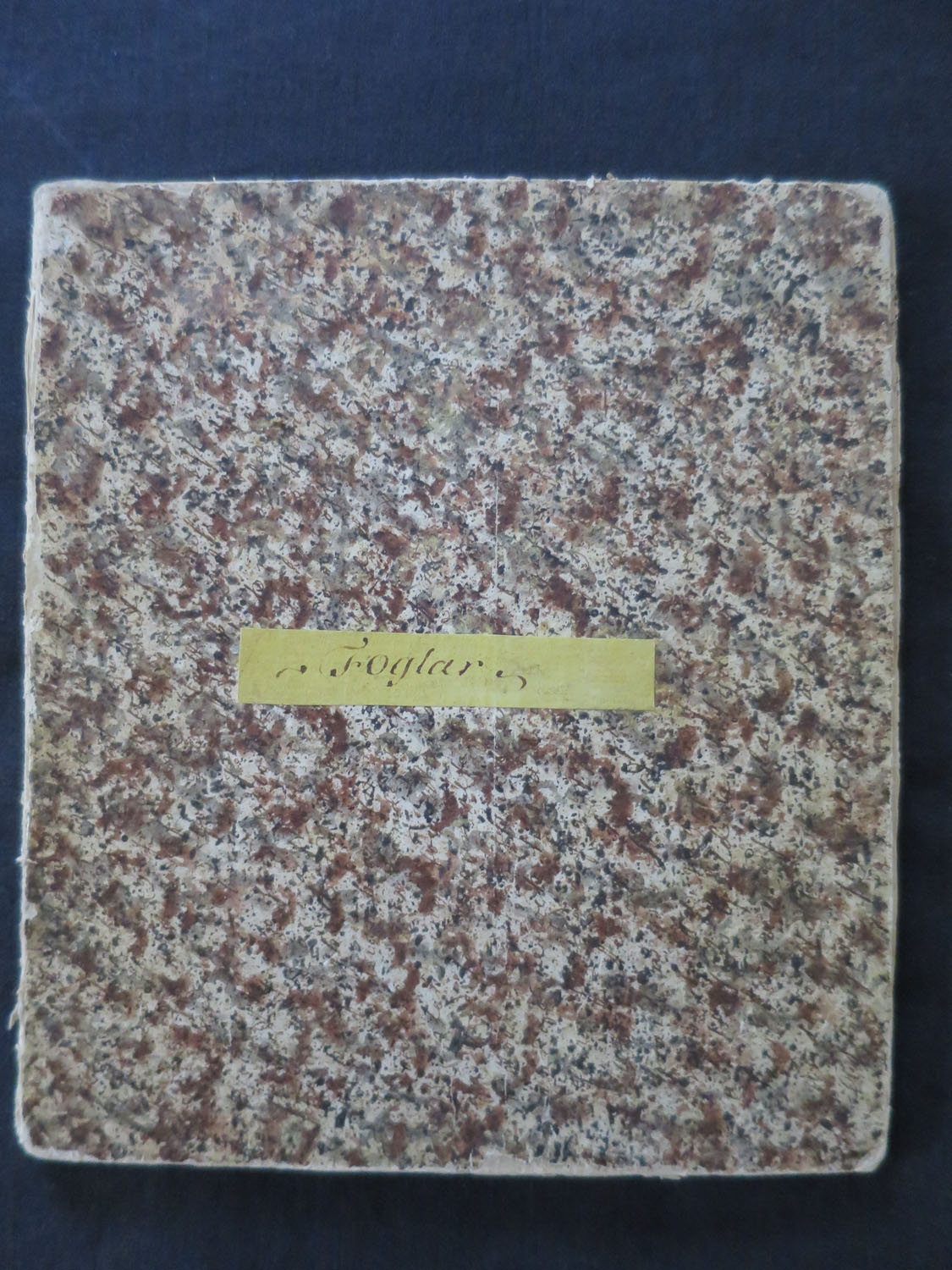 Ett privatbundet band utan årtal. Lös i bindningen, med två små revor i två av bladen. Boken har marmorerade pärmar med en påklistrad och handskriven etikett F o g l...