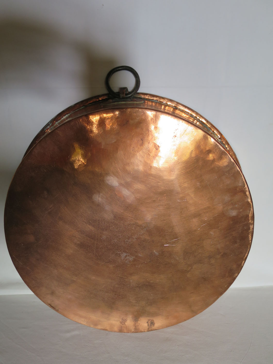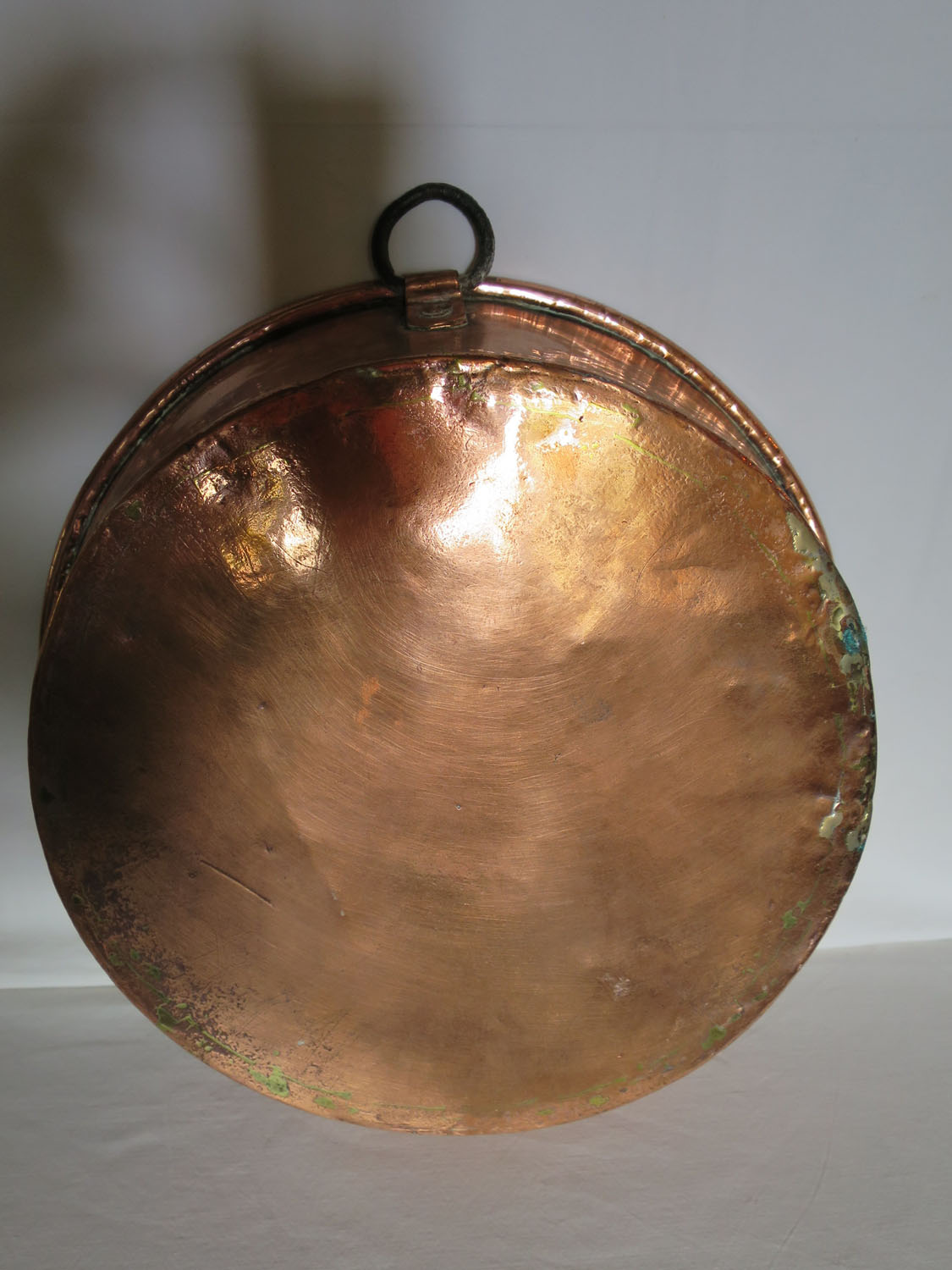 Slaglödd och klamrad kopparbunke i tjock kopparplåt med sliten förtenning. Användes bl.a. att göra ostkaka i.