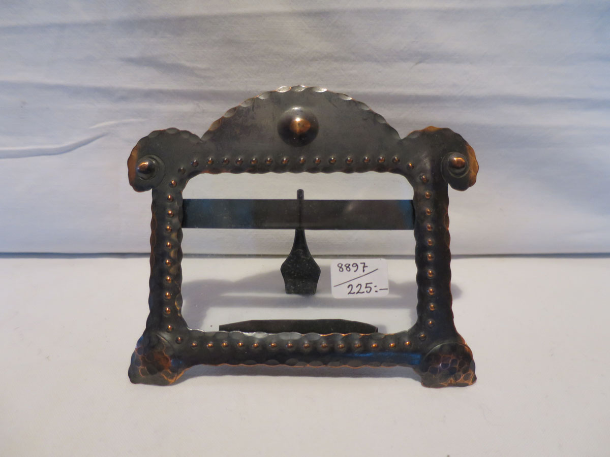 Fotoram i hamrad- och patinerad koppar för placering på plant underlag. Komplett med glas och i mycket fint skick.