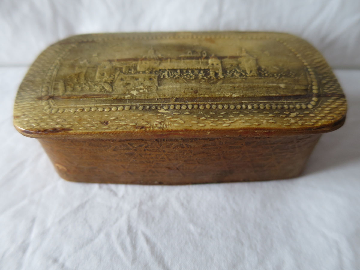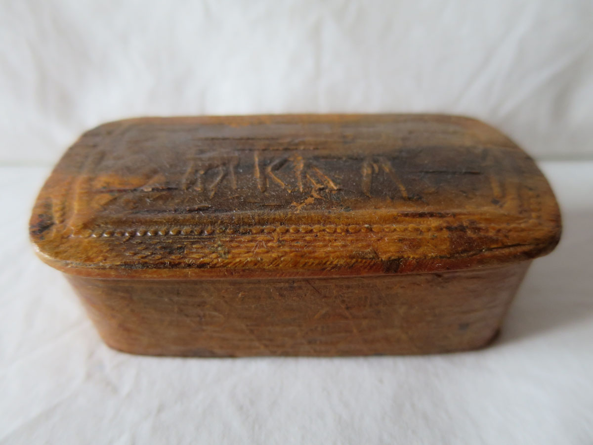 Snusdosa av pressad näver med bild av hus och människor (?) på locket.