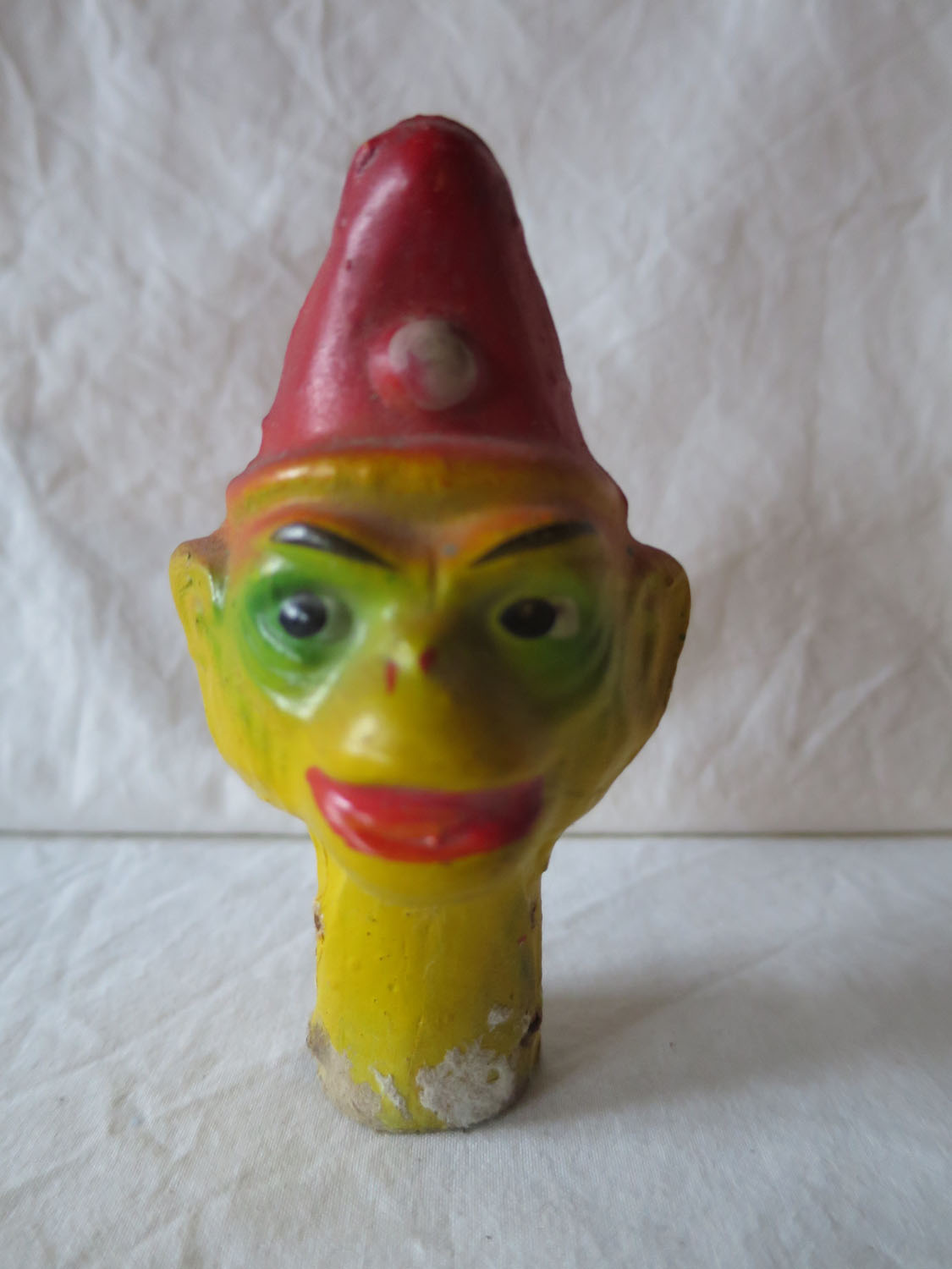 Aphuvud, målat och tillverkat av papp. Kan ha varit en kasperdocka eller någon annan leksak.