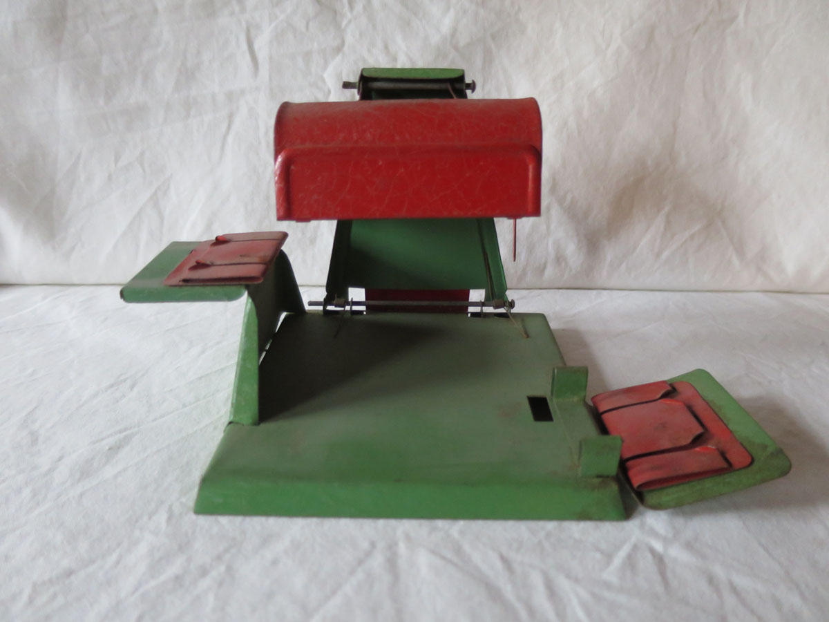 Plåtleksak som påminner om någon slags våg då buren med handtaget är fällbart. Vet heller inte om den är komplett, men den verkar hel överallt. 1950-tal.