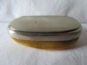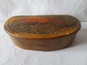 Snusdosa av pressad näver med bild av hjortar på locket.