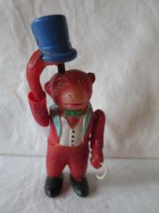 Apa av plast, som när den blir uppdragen lyfter på hatten. Tyvärr fungerar inte fjäderverket, men apan är i övrigt hel.