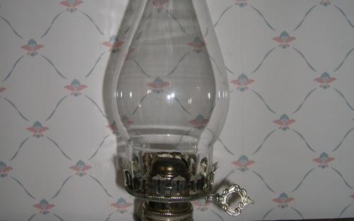 Oljehus av pressglas med brännare av förnicklad metall.Mycket vackert brännglas med "krusad" avslutning längst upp.Ovanlig modell av fotogenlampa. Höjd: 33 cm Oljehusets diameter: 11,5 cm Pris: 450 krArtikelnummer: 495Lampor & belysning