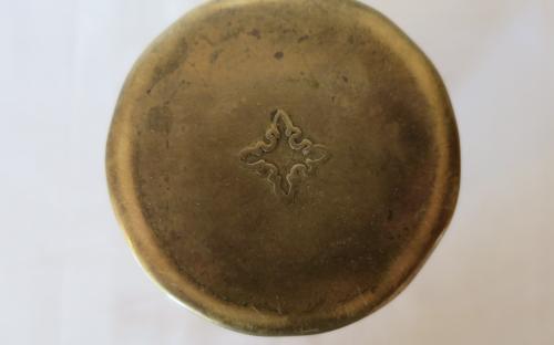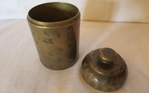 Burk av gjuten brons. Tung och kraftigt sliten burk med okänt ursprung och användningsområde, möjligen snus eller tobak. Burken är troligen inte svensk. Ålder ??? Höjd: 11,8 cm Diameter: 7 cm Pris: 450 krArtikelnummer: 9739Kuriosa & samlarföremålÖvrigt