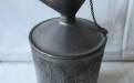 Liten fotogendunk av bleckplåt där toppen är utformad som avhällningspip som går att tillslutas med en kork fastsatt i en kedja. Ett litet rosthål finns i botten, vilket bör gå att laga. Annars i ett mycket fint skick.