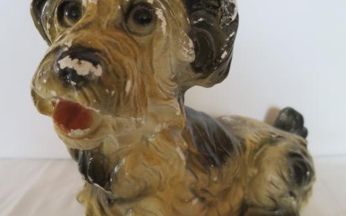 Stor hund av gips. Målad, men med en del avskavda partier. Mycket charmig. Längd: 24 cm Höjd: 20,5 cm Pris: 150 krArtikelnummer: 9593Kuriosa & samlarföremålKeramik & porslin