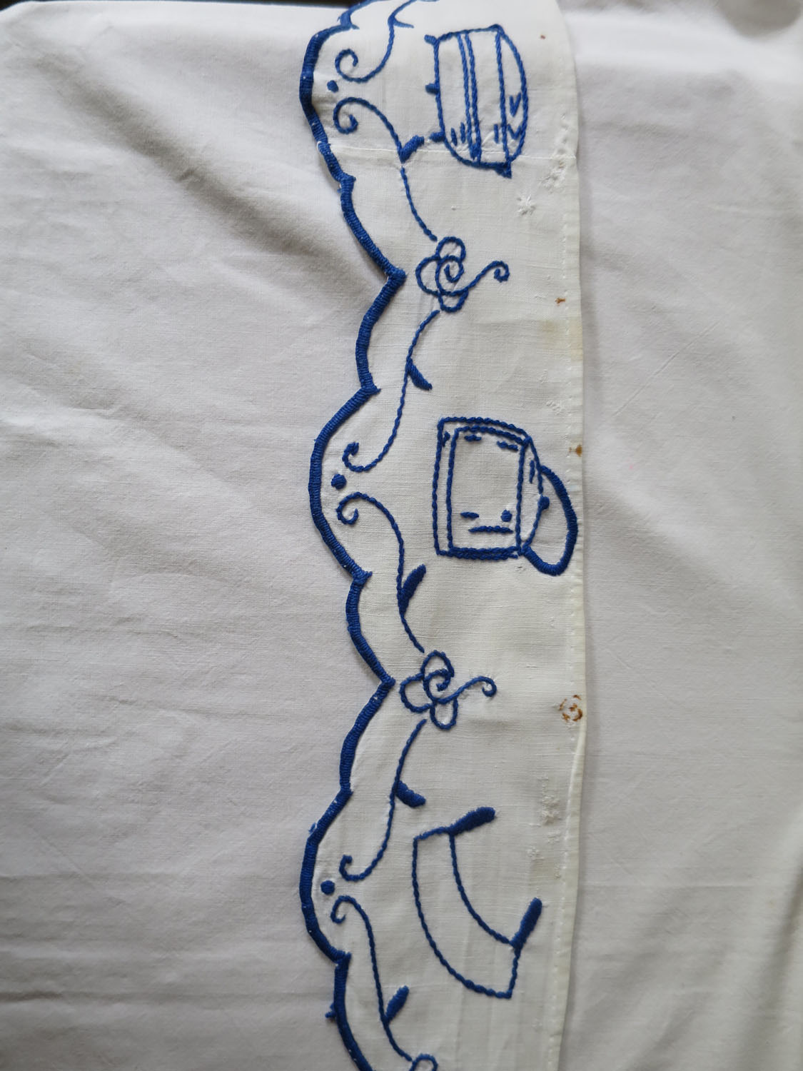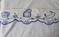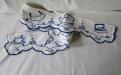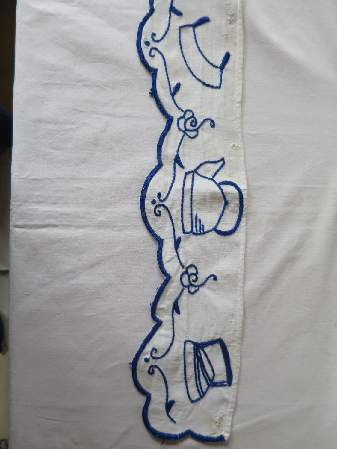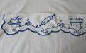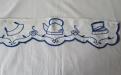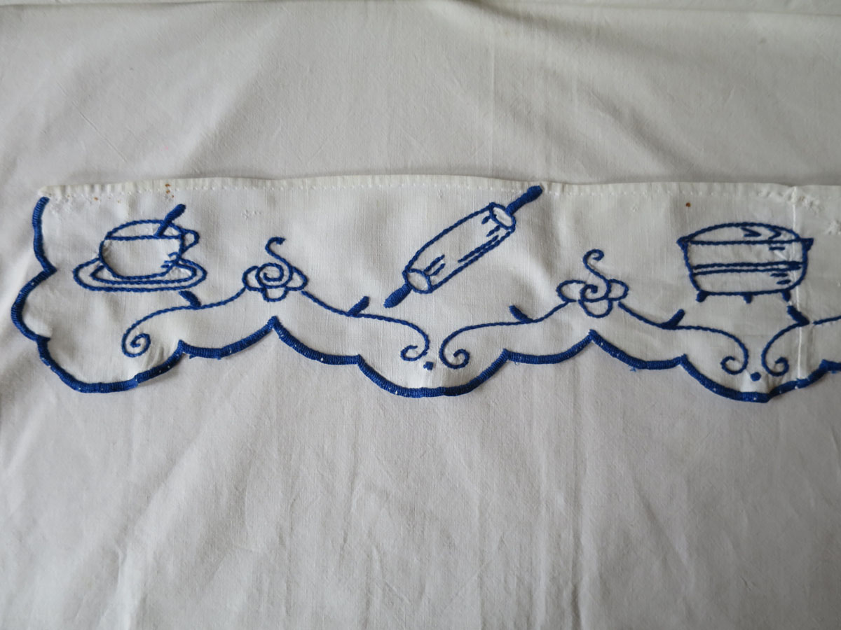 Hylldekoration av broderat tyg. Sliten, lagad och med en del rostfläckar efter häftstift, men väldigt charmig. Hyllremsan fästes t. ex. i kanten på ett hyllplan i ett skåp eller på en skafferihylla.