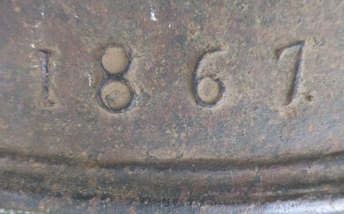 Gjuten järnhäll daterad 1867 i fint skick, även om den blivit avkortad en liten bit. Mått: 1.16 x 0.41 m Pris: 3.500 krArtikelnummer: 1557Spisar & kaminer