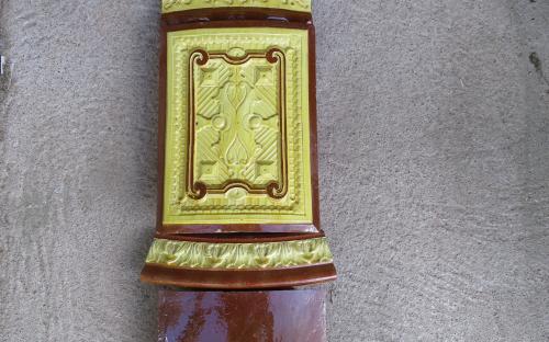 Rund hantverkskakelugn med kakel i relief från 1800-talets mitt. Ugnen är rengjord och rensad från lera och tegel. Trasiga kakel har lagats. Renoverad, tidsenlig järnlucka medföljer. En mycket fin ugn helt klar för uppsättning.