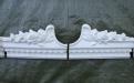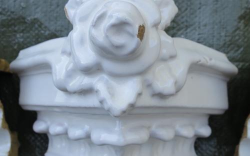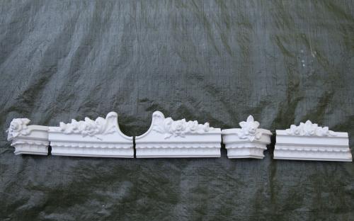 Vit kakelugnskrona för en rektangulär ugn. Framsidan består av 2 mittkakel + 2 hörnkakel. Endast ett kakel finns från hörnet in mot väggen. Det kakel som saknas kan gjutas i gips och målas i snarlik nyans. Gipsdelen tål värme då den sitter i kronan. Delarna är djupstämplade i leran med Norrköping och namnet på en kakelugnsfabrik som inte går att tyda.