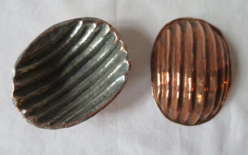 Två små förtenta kakformar av koppar. Längd: ca 7,8 cm Pris: 90 kr/st.Artikelnummer: 2041-1KökKopparföremålLoppis (inget kostar mer än 100 kr)