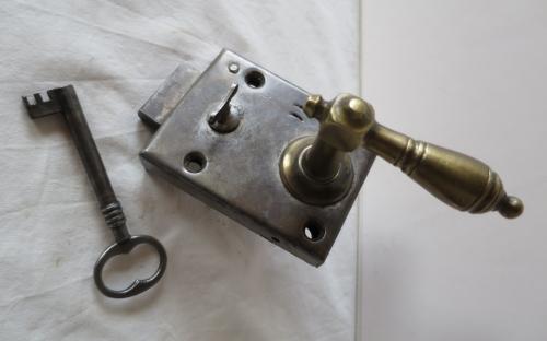 Renoverat lås med mässingstrycke och låsvred av järn. För högerhängd dörr. Mått: 9,5 x 7,3 cm Pris: 700 krArtikelnummer: 2926Lås