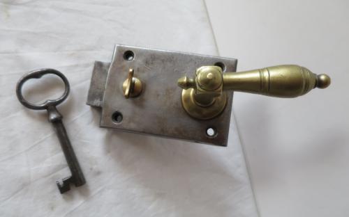 Renoverat lås med mässingstrycke och låsvred av mässing. För högerhängd dörr. Mått: 10 x 7 cm Pris: 700 krArtikelnummer: 2928Lås