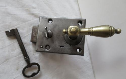 Renoverat lås med mässingstrycke och låsvred av järn. För vänsterhängd dörr. Mått: 9,5 x 7,3 cm Pris: 700 krArtikelnummer: 2929Lås