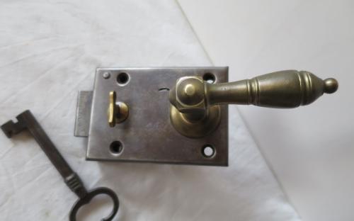 Renoverat lås med mässingstrycke och låsvred av mässing. För högerhängd dörr. Mått: 10 x 7 cm Pris: 700 krArtikelnummer: 2931Lås