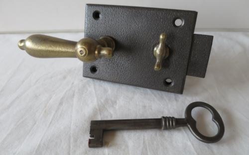 Renoverat lås med mässingstrycke och låsvred av mässing. Porig yta efter gravrost. För högerhängd dörr. Mått: 10 x 7,2 cm Pris: 700 krArtikelnummer: 2938Lås