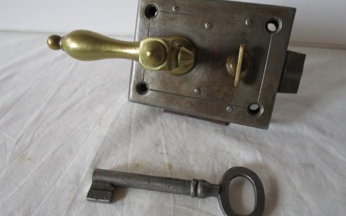 Renoverat lås med mässingstrycke och låsvred av mässing. För högerhängd dörr. Mått: 10,3 x 8 cm Pris: 800 krArtikelnummer: 2957Lås
