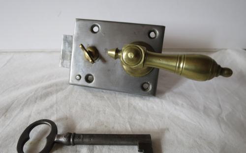 Renoverat lås med mässingstrycke och låsvred av mässing. För vänsterhängd dörr. Mått: 9,6 x 7,2 cm Pris: 700 krArtikelnummer: 2958Lås