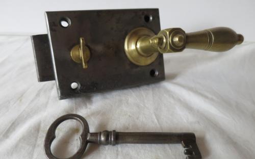 Renoverat lås med mässingstrycke och låsvred av mässing. För vänsterhängd dörr. Mått: 10 x 7 cm Pris: 700 krArtikelnummer: 2959Lås
