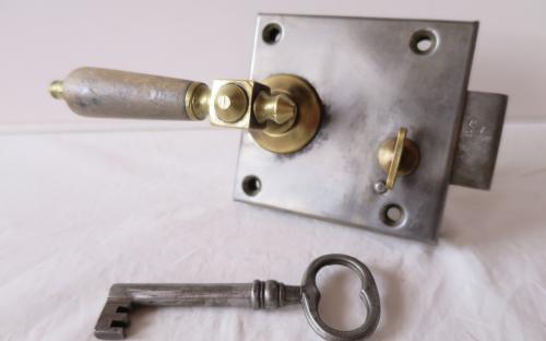 Renoverat lås med trycke av mässing och trä samt låsvred av mässing. Ett ovanligt kammarlås med trä i trycket! Passar både till vänster- och högerhängd dörr. Mått: 9 x 8,5 cm Pris: 900 krArtikelnummer: 2852Lås