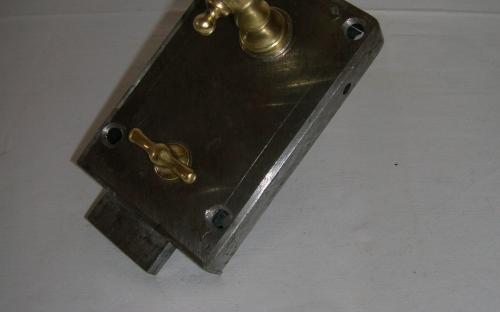 Renoverat lås med trycke och låsvred av mässing. 1800-tal. För högerhängd dörr. Mått: 11,4 x 7,4 cm Pris: 1.200 krArtikelnummer: 1766Lås