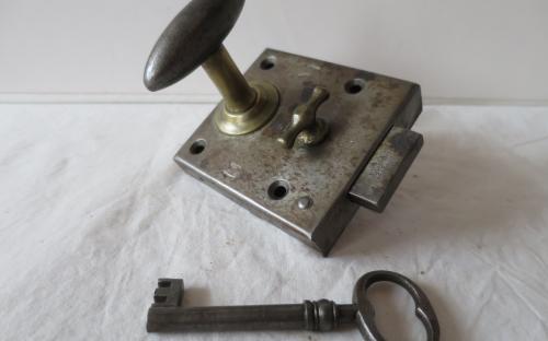 Renoverat lås med spolformat järnvred och låsvred av mässing. Passar både vänster- och högerhängd dörr. Mått: 9,3 x 8,5 cm Pris: 750 krArtikelnummer: 2859Lås