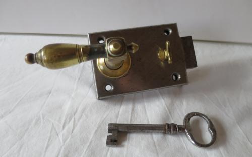 Renoverat lås med mässingstrycke och låsvred av mässing. För vänsterhängd dörr. Mått: 10 x 7 cm Pris: 700 krArtikelnummer: 2267Lås