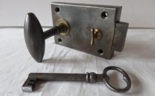 Renoverat lås med spolformat järnvred och låsvred av mässing. För högerhängd dörr.