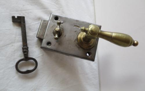 Renoverat lås med mässingsvred och låsvred av mässing. För högerhängd dörr. Mått: 10 x 7 cm Pris: 700 krArtikelnummer: 2925Lås
