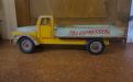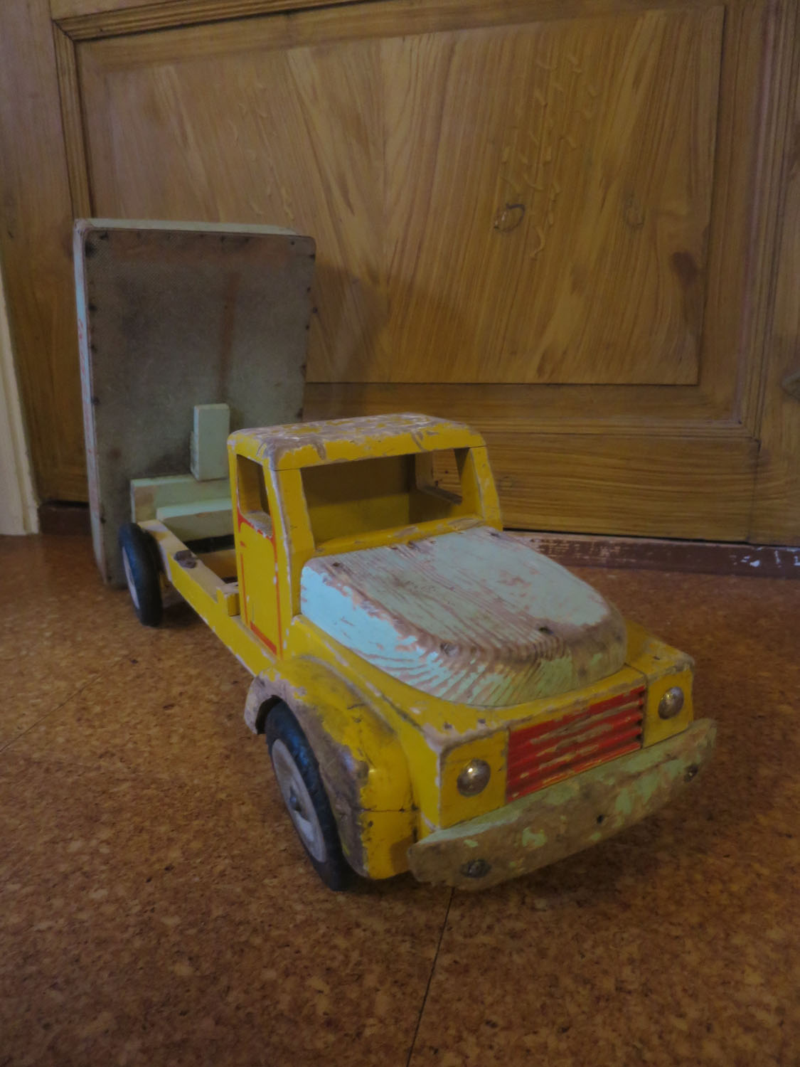 Stor leksakslastbil av trä med hjul av gummi och med texten Bilexpressen skrivet på flakets bägge långsidor. Bilen är sliten och lagad, men färgmässigt helt i original. Flaket går att fälla upp.1940-tal. Ett mycket charmigt inredningsföremål.