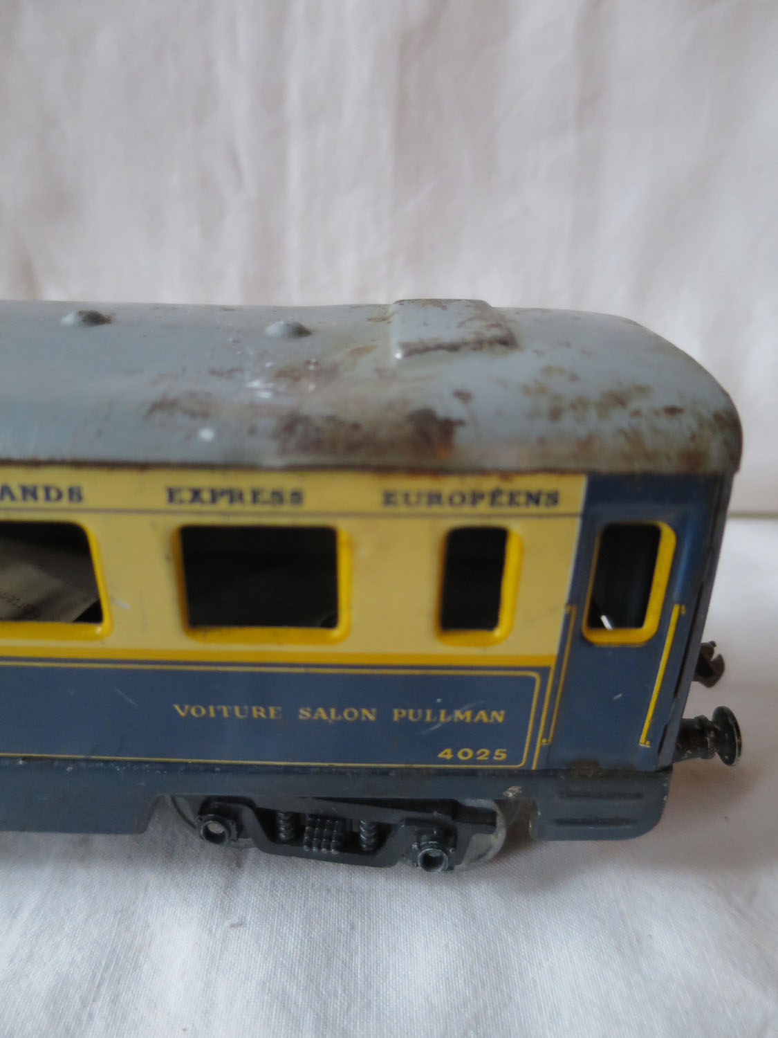 Trains Hornby: Passagerarvagn. Plåtskada på taket och kopplingarna trasiga.