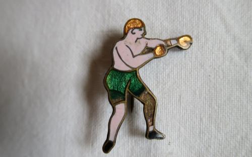Nålmärke av metall och emalj föreställande boxare. Emaljbortfall på ena benet. På baksidan märkt EGISTER. Längd: 2,7 cm Pris: 45 krArtikelnummer: 8171Majblommor/nålmärken