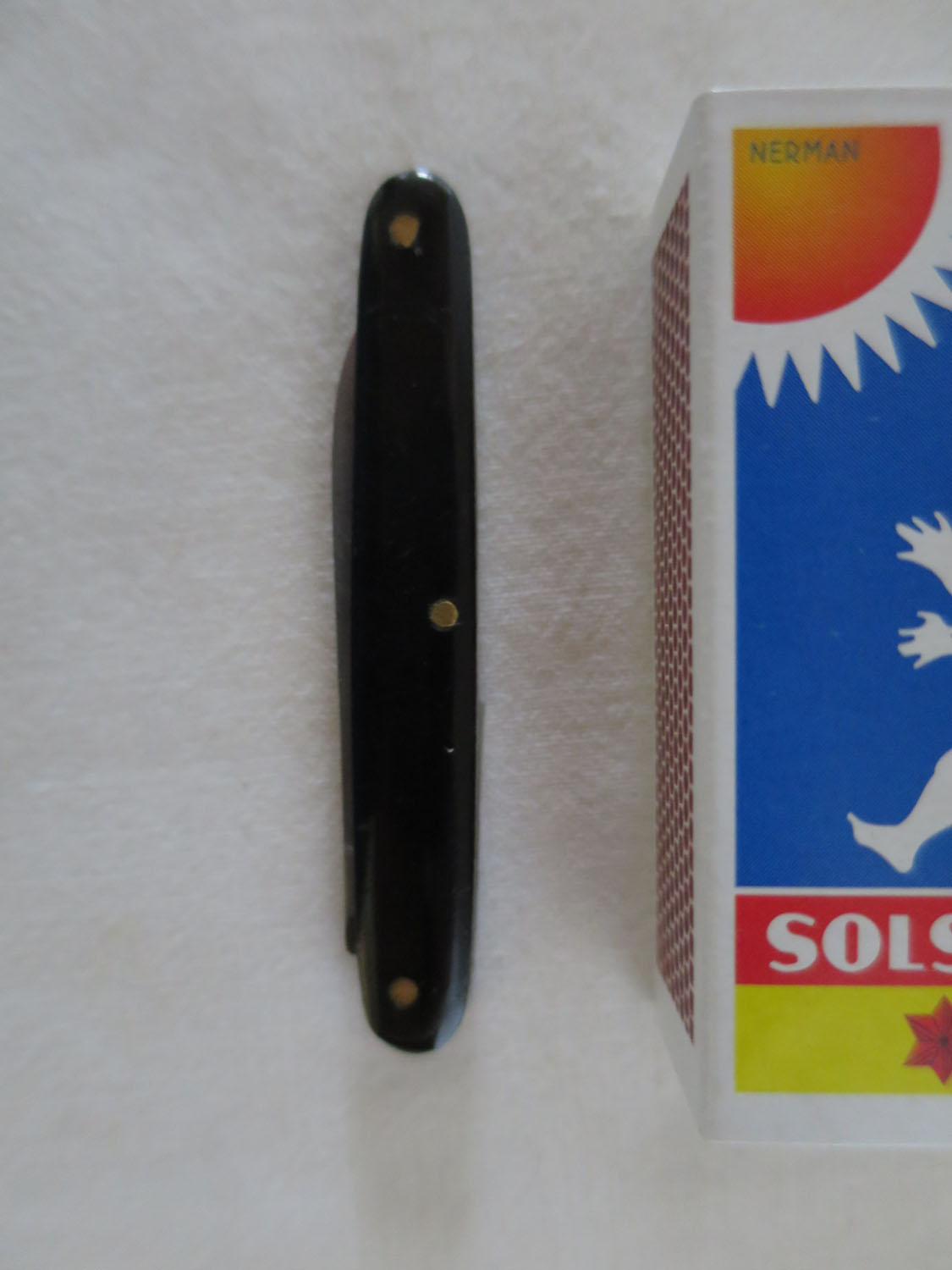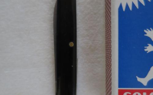 Pennkniv med 1 blad och sidor av bakelit(?). Bladet märkt Garantie Solingen. Längd utan blad: 6,2 cm Pris: 135 krArtikelnummer: 8998Kuriosa & samlarföremål