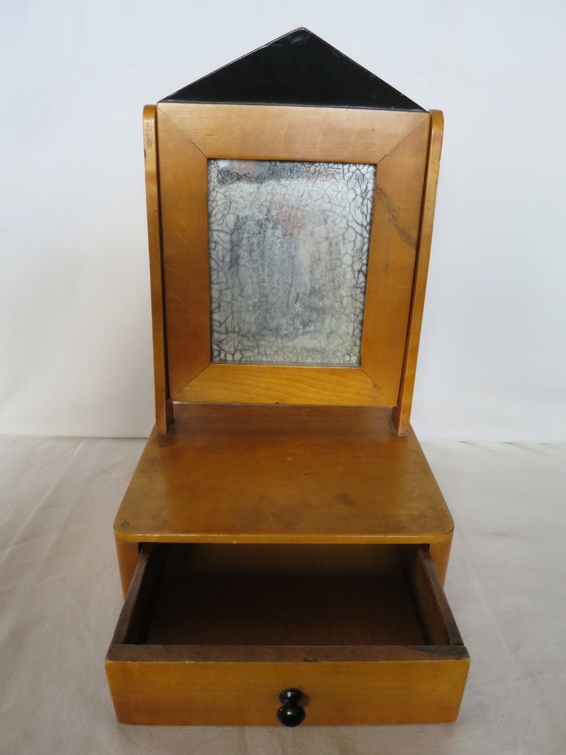 Liten pigtittare/lådspegel av björk från Karl-Johan-tid, 1800-talets första halva, tillverkad för ett barn. Lådans botten och spegelns baksida är senare ditsatta, men spegelglaset är original. Som helhet ett mycket fint skick.