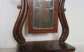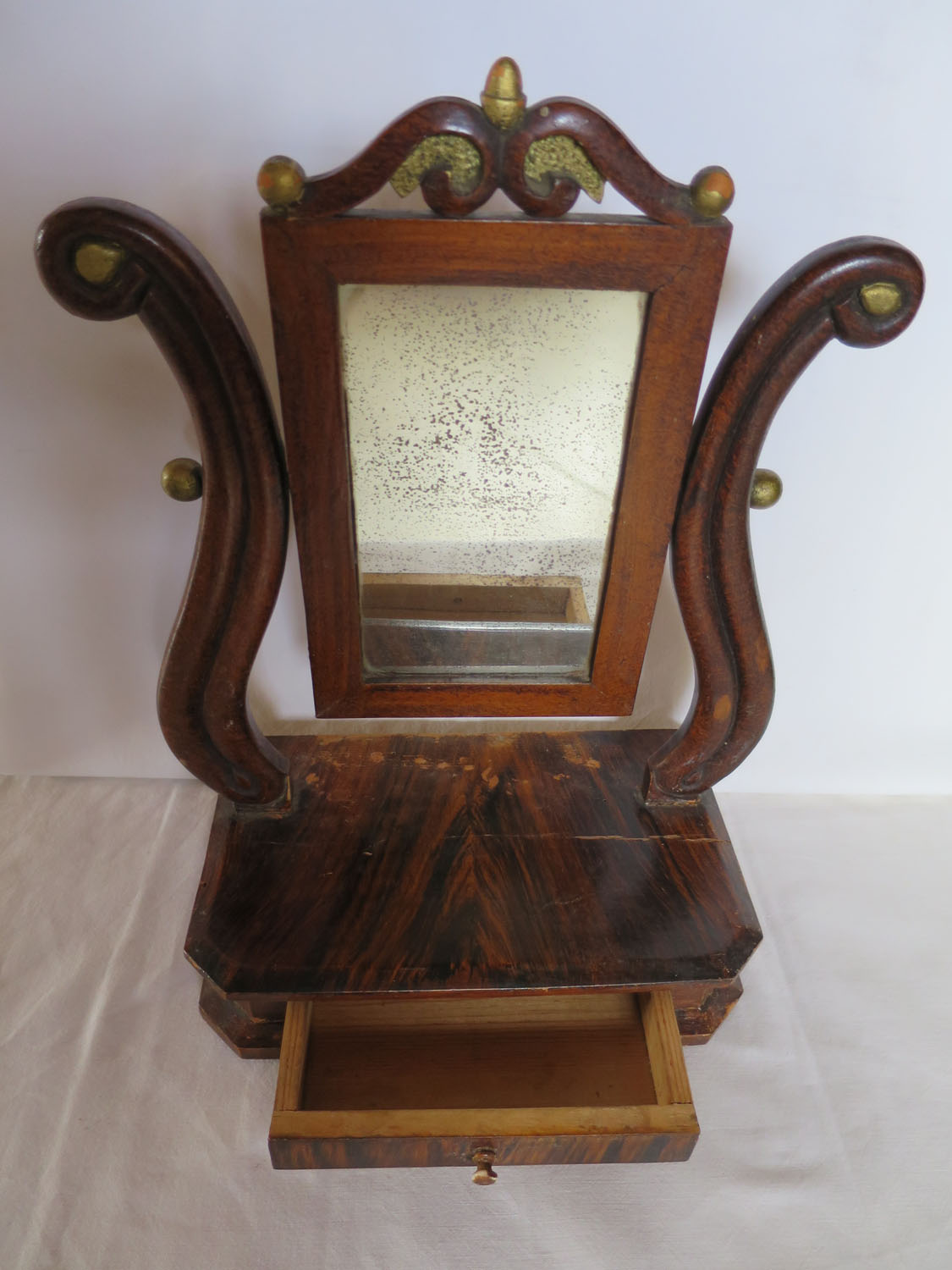 Liten pigtittare/lådspegel i nyrokoko tillverkad för ett barn. Spegeln är träådringsmålad och allt är i originalskick. Under den lilla utdragslådan står sirligt skrivet med bläck: Hilmer R. Jeanzon Februari. 1898 . Möjligen var det en stolt fader som gjort en fin present till sin dotter?!?