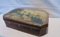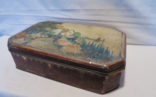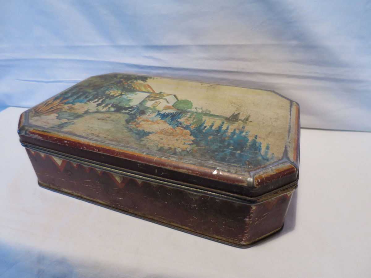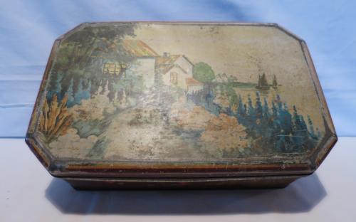 8-kantig plåtburk med lock på gångjärn och idyllisk bild på locket. Utsidan sliten , men acceptabelt ren insida. Mått: 26,8 x 16,8 x 7,1 cm Pris: 170 krArtikelnummer: 5483KökLoppis (inget kostar mer än 100 kr)