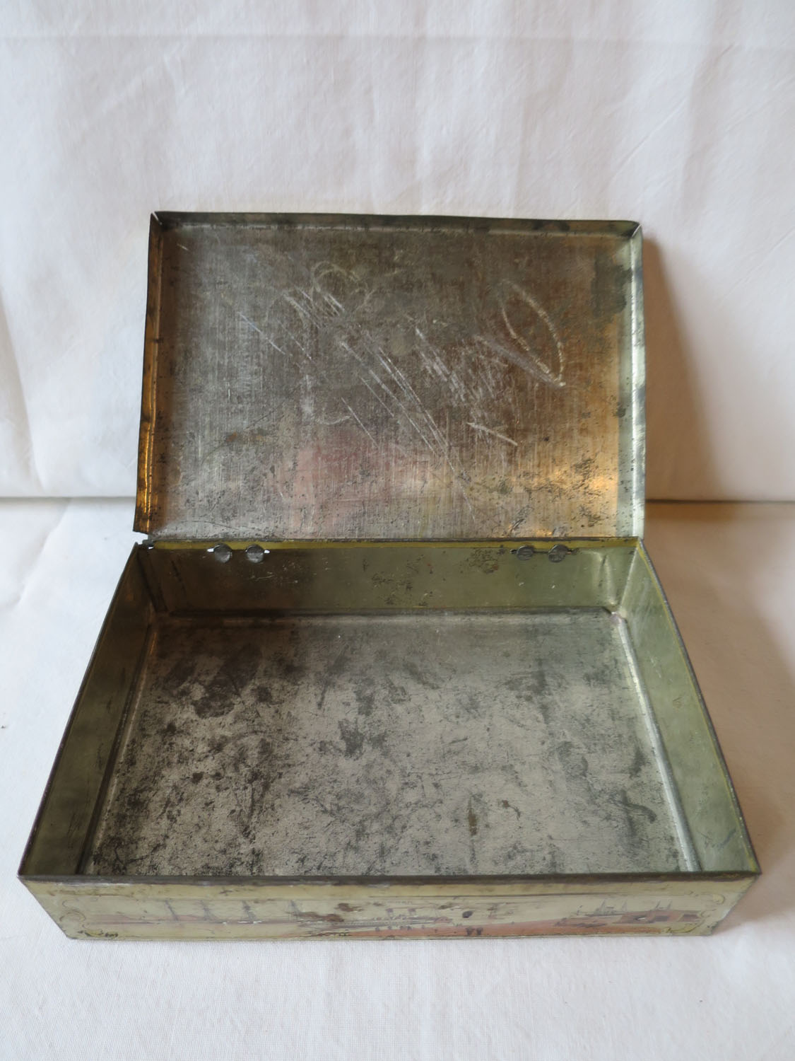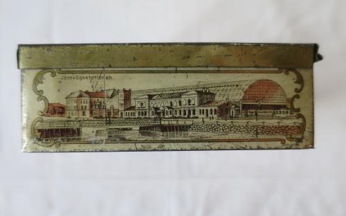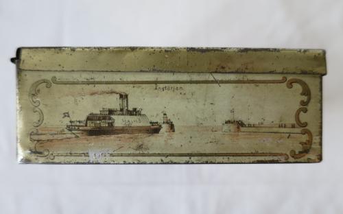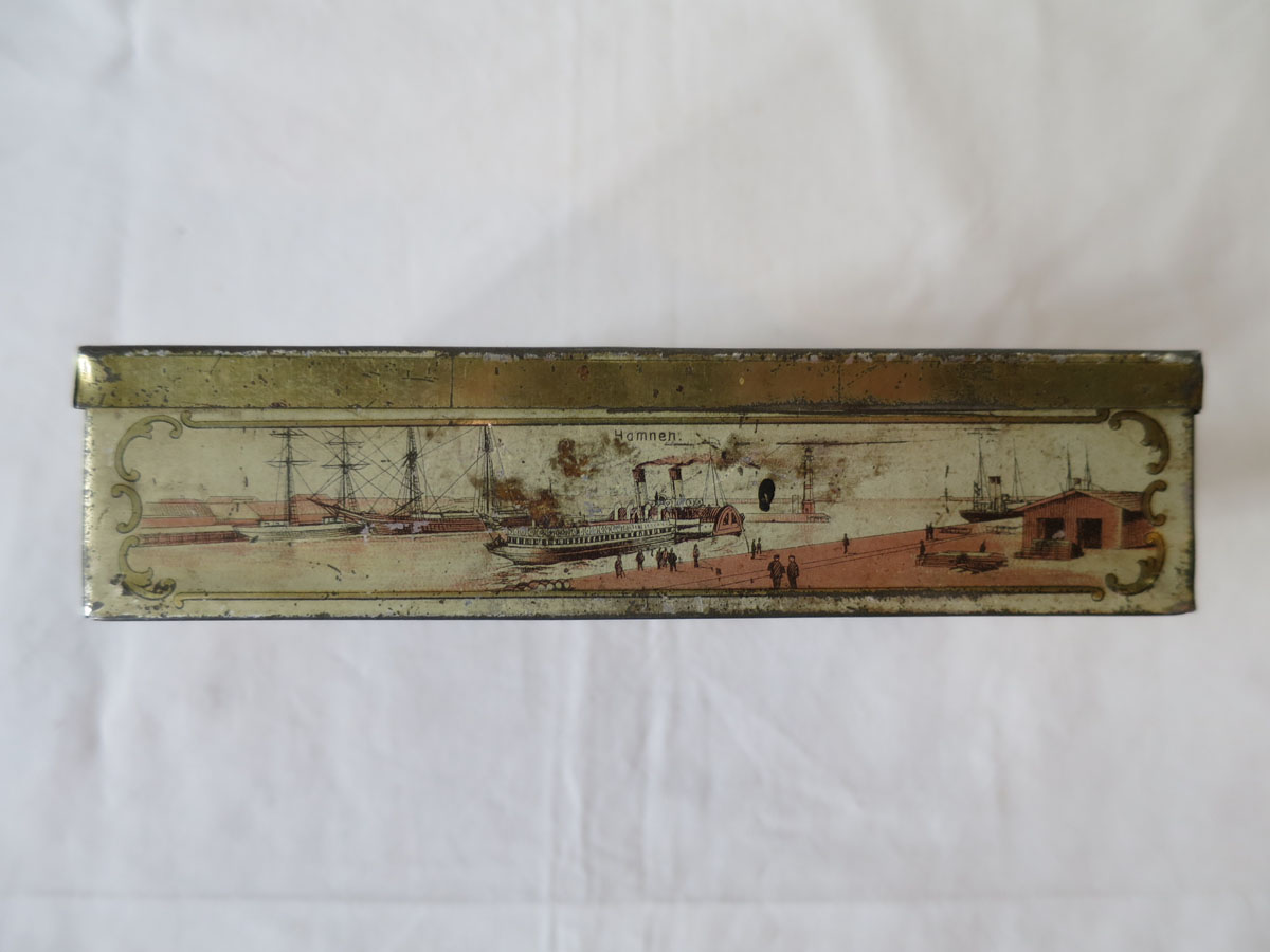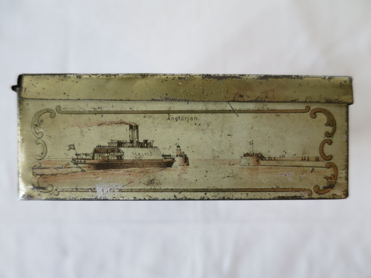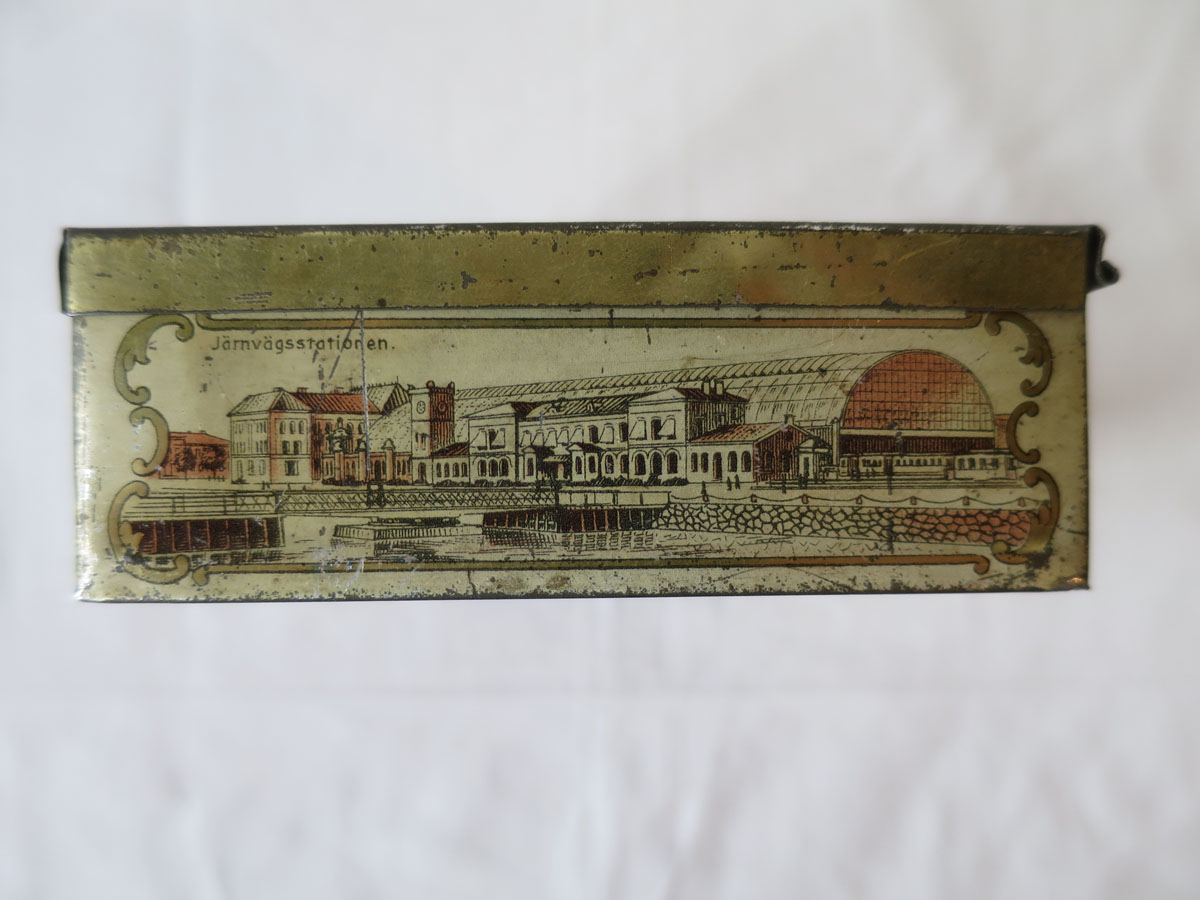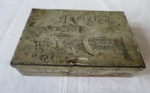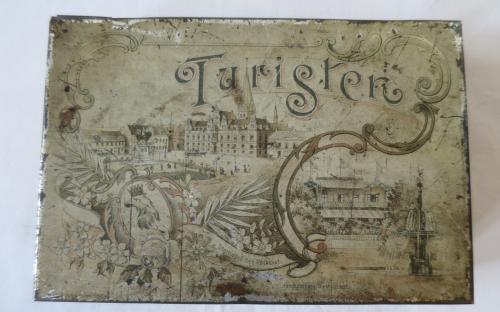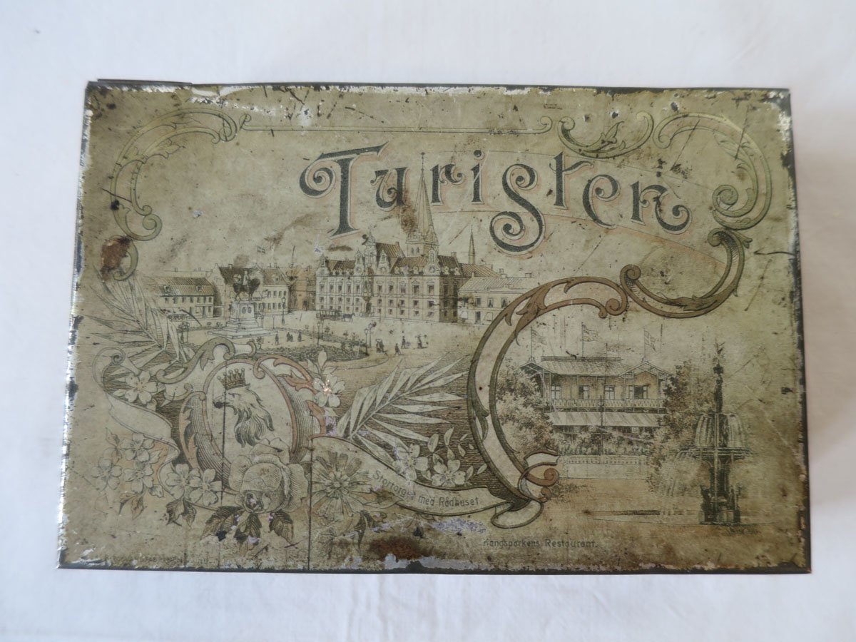 Litet plåtskrin med gångjärn. Har förmodligen innehållit någon slags konfekt och vänt sig till turister som besöker Malmö. Plåtasken har på fem sidor bilder litograferade på bleckplåt föreställande olika platser i Malmö. På locket står det Turisten och bilder på Stortorget med Rådhuset samt Kungsparkens Restaurant. Övriga sidor visar Hamnen, Järnvägsstationen, Hotell Horn, Banhallen, Hotell Kramer och Ångfärjan. Skrinet, som är från 1800-talets slut, är i hyfsat bra skick och inte vanligt förekommande i handeln.