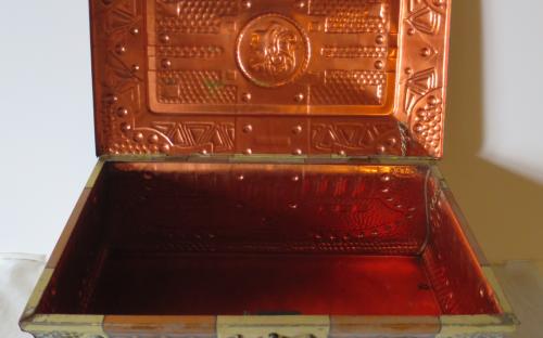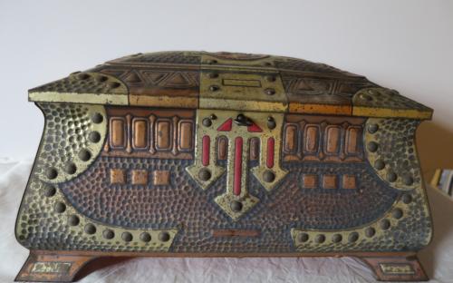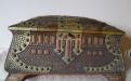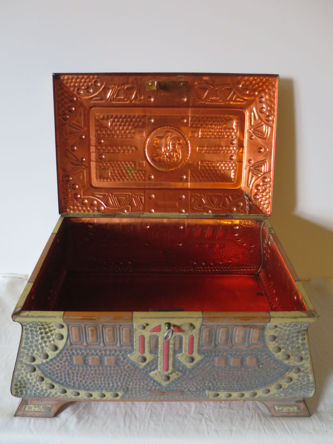 Stort skrin av litograferad plåt med rokokoform och jugenddekoration och med låsbart lock på gångjärn. Nyckeln är troligen original. Skrinet har en del rostfläckar, men är väldigt rent och fräscht inuti. Ett mycket sällsynt plåtskrin.