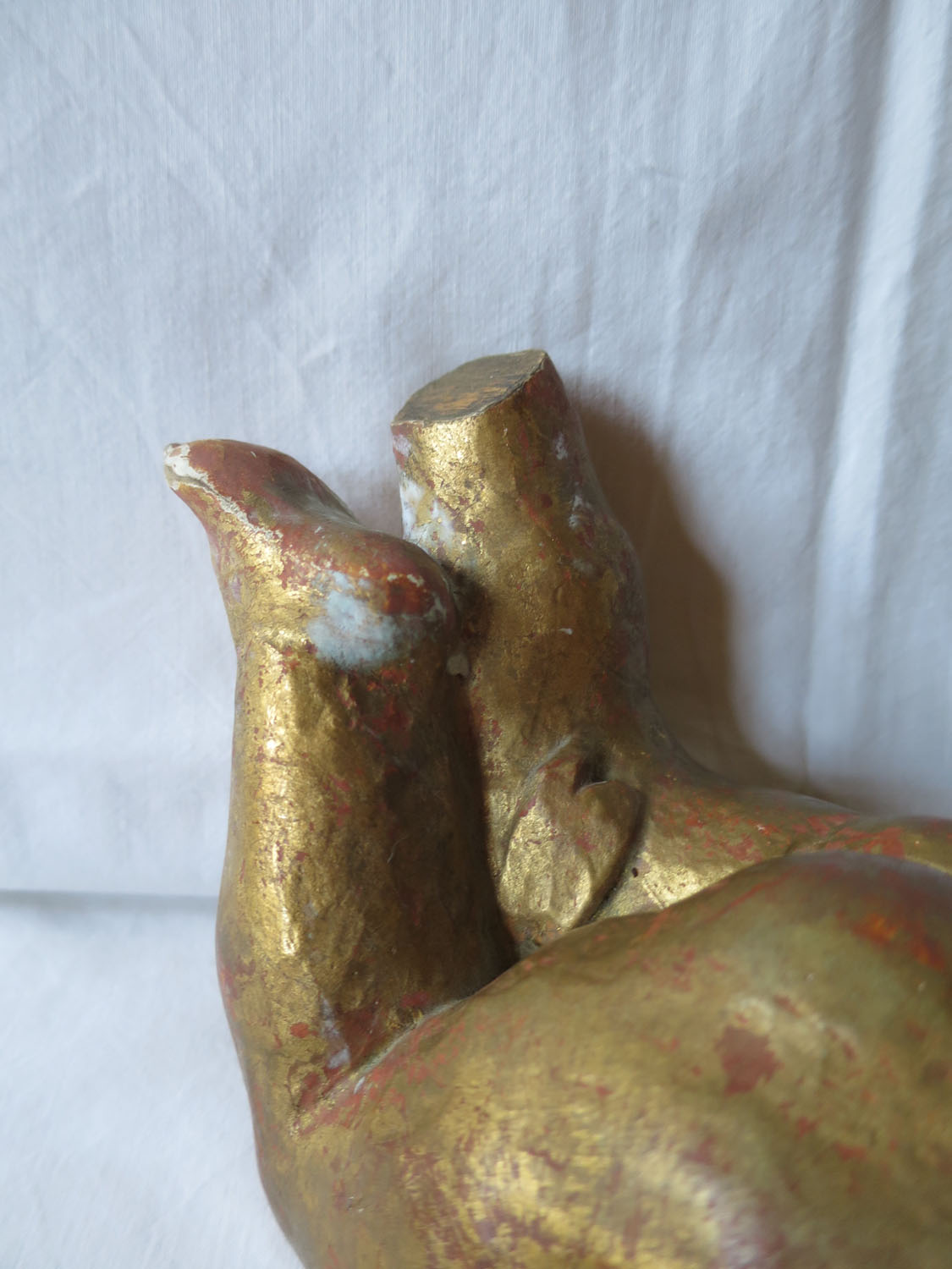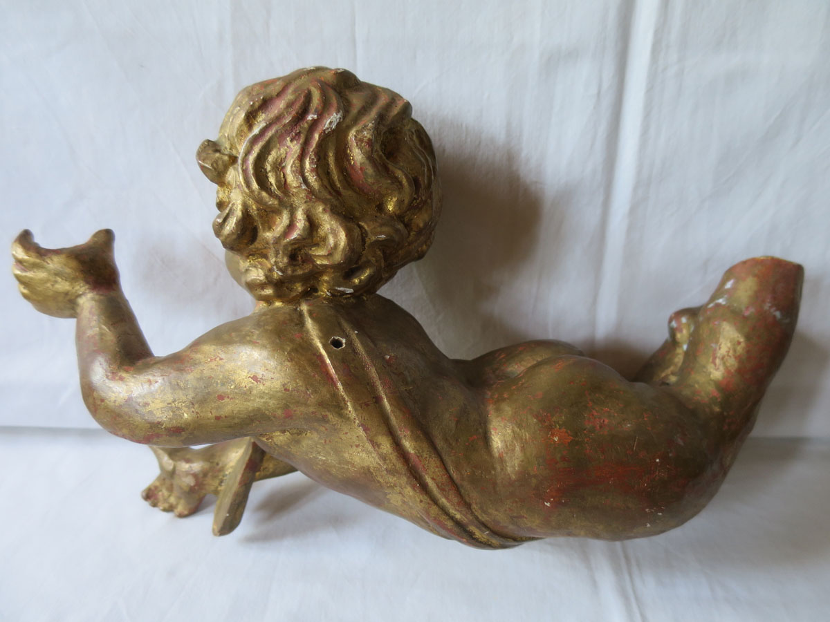 Förgylld putto av trä som med stor säkerhet tagits från en sakral miljö. Ena foten är kapad, men detta behöver inte betyda att den har sett ut så här från början utan att den kanske senare fått en annan placering och modifierats i efterhand. Vänstra skuldran har ett borrhål som kan tyda på någon form av upphängning. Armarna och händerna antyder att någonting varit placerat där Mycket dekorativ och i fint skick.