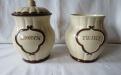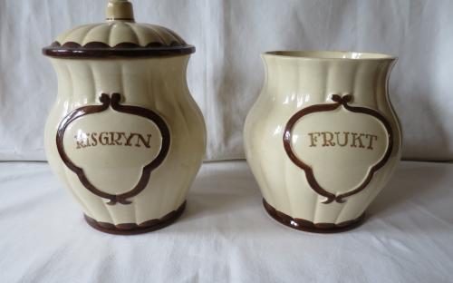 2 st. Pyro-burkar, märkta RISGRYN och FRUKT, men bara ett lock. Säljs var och en för sig, och den som säljs först får ta även locket då det passar bägge burkarna. Burk med lock kostar då 280 kr, medan burk utan lock kostar 150 kr. Bägge är i mycket fint skick.