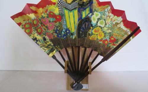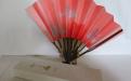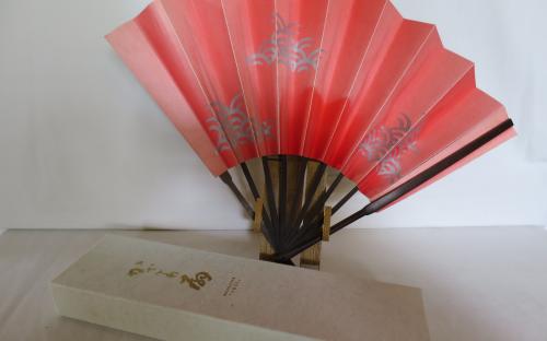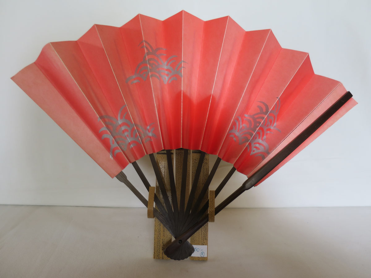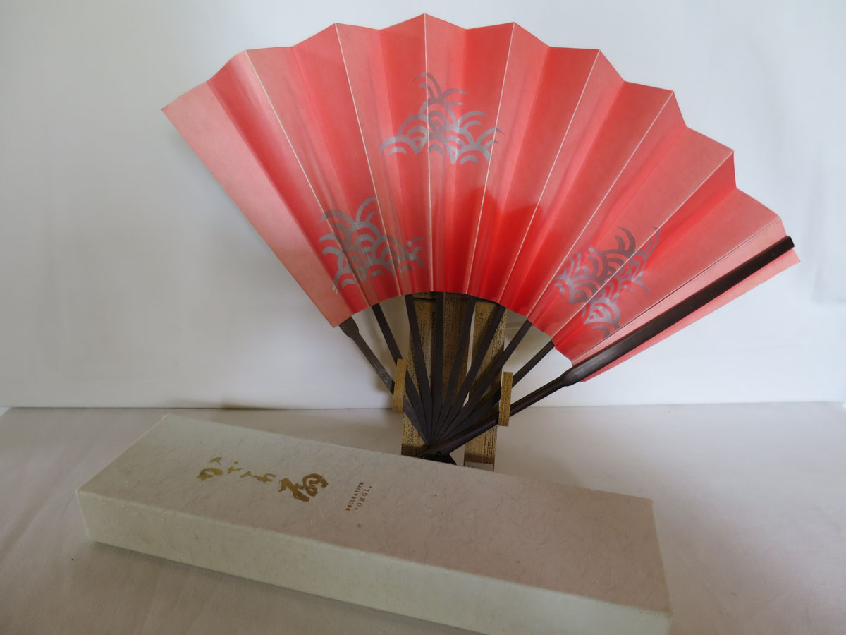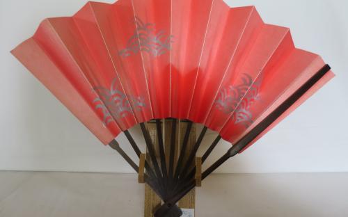 Japansk solfjäder av bambu(?) och papper. I originalasken medföljer ett ställ av bambu, som både går att hänga på väggen och ställa på ett plant underlag, där solfjädern kan visas utfälld. I asken medföljer också ett dokument på japanska och engelska där man kallar denna solfjäder Decorative "OHGI". 1960-tal.